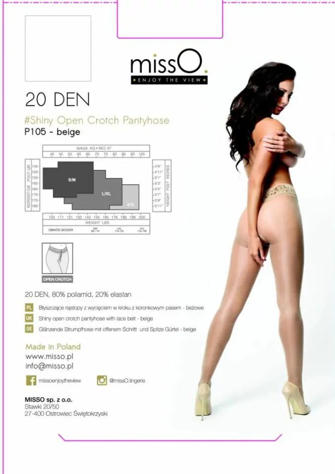 Sexy women's tights 20 DEN, with a slightly lowered waist, finished with a lace elastic band with one silicone strap for comfort. Very feminine, silky to the touch with an extremely strong shine. They have a smoothly finished intimate cutout with a diameter of about 15 cm, invisible reinforcement of the fingers and a flat seam.