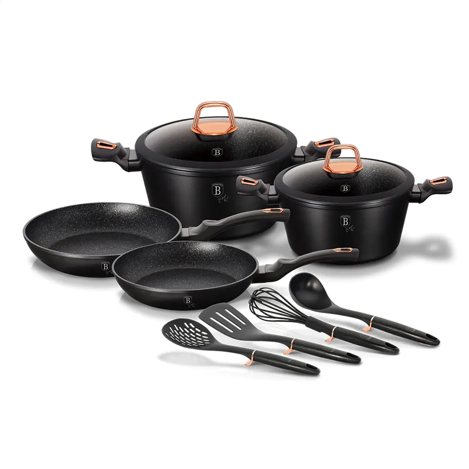 The BLACK ROSE series pots and pans by BERLINGER HAUS are made of high-quality forged aluminum covered inside with a triple granite coating (marble) with a very high hardness coefficient. Black outer sheath. These attractive and fashionable dishes are equipped with SOFT TOUCH (silicone handle) as standard. Suitable for all types of cookers: gas, electric, ceramic, halogen, induction. The TURBO INDUCTION system (they heat up very quickly) allows you to save up to 35% of energy.Included:pot with lid O20 x 10.4cm (2.5L)pot with lid O24 x 11.8cm (4.1L)frying pan O20 x 4.5cmfrying pan O24 x 4.8 cma set of kitchen utensils - 4 pcs. Features:Triple anti-stick granite coatingMaterial: high quality die-cast aluminumSoft-Touch Handle: silicone gripTURBO INDUCTION system (they heat up very quickly) 35% energy savingDishwasher safeFor all types of cookers: gas, electric, ceramic, halogen, inductionBlack colour