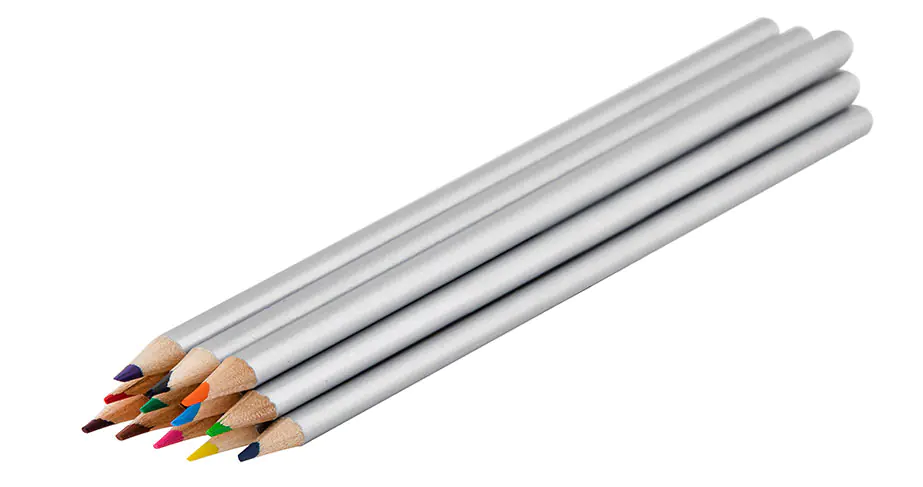 Crayons in a metal pencil case