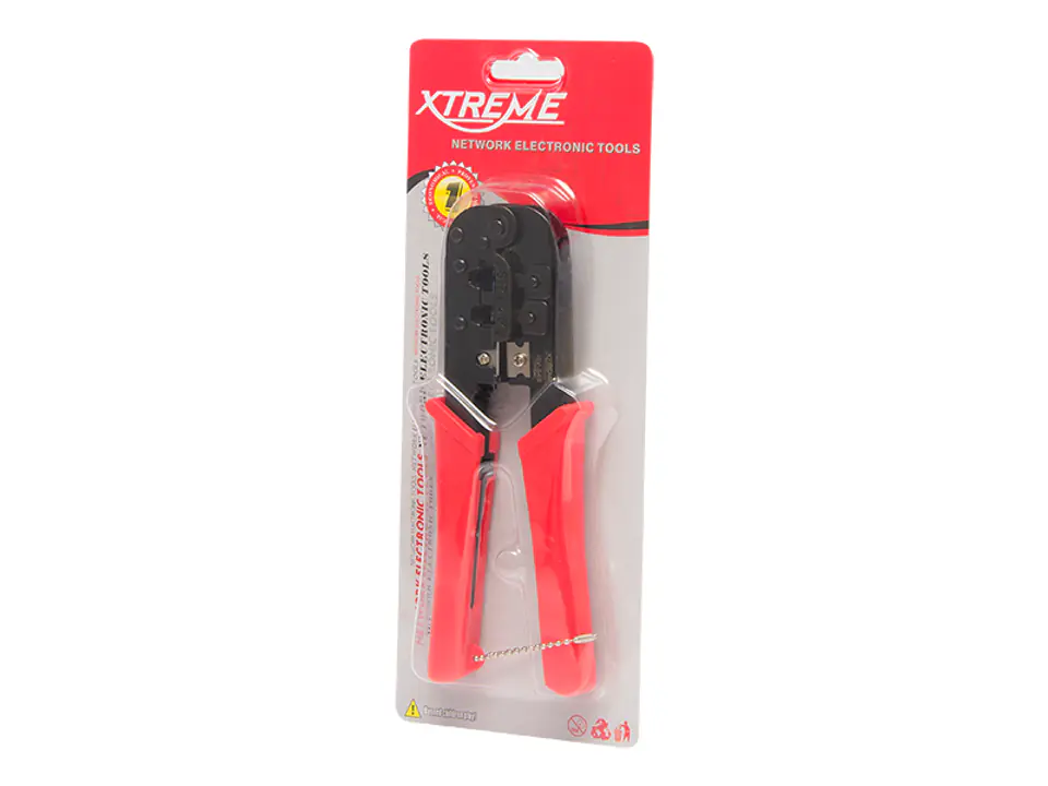 Professional tool for crimping telephone plugs. Simple and convenient operation, solid workmanship. The crimping tool also allows cutting and stripping insulation.