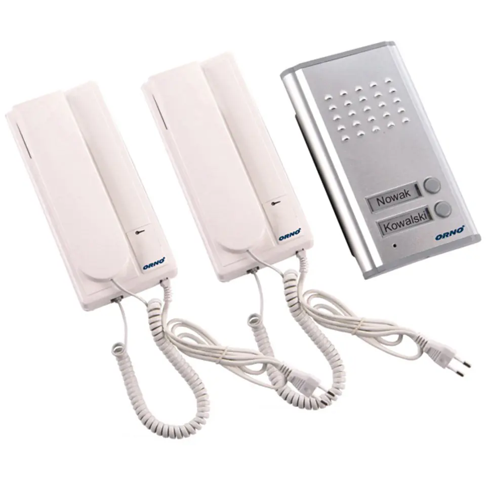 Two-family intercom set, flush-mounted installation, use of or-DOM-RL-901DN cover allows surface mounting, illuminated space for names, uniphones have a built-in power supply and power cord, electric strike does not require additional power supply.