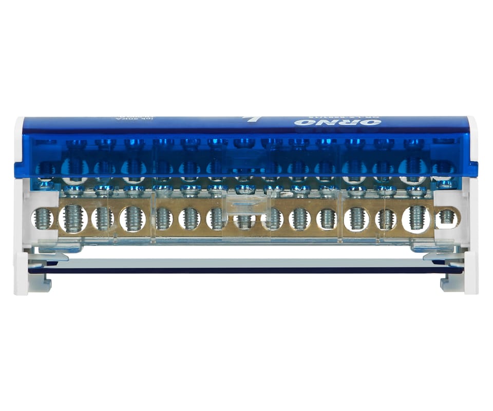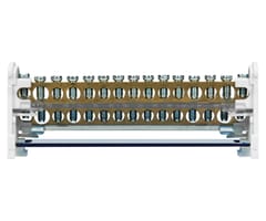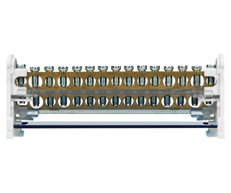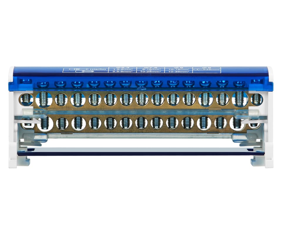 Distribution blocks mounted on a DIN rail or mounting plate are made of 2 clamping rails in the housing. They are used in electrical switchboards for the distribution of potentials and wiring.