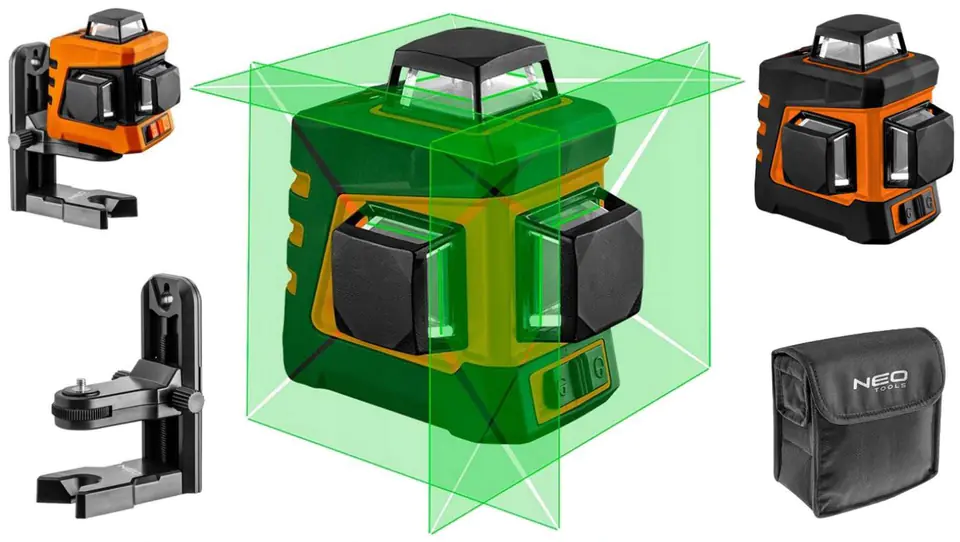 Neo self-leveling cross laser with a wavelength of 520 nm is used in construction and finishing works. The product is used to determine the line in 3planes over a distance of up to 20 meters. The green light beam is up to 4 times brighter than the standard red. The cross laser is equipped with a self-leveling mechanism in the range of +/- 4°, which allows accurate work without the need to manually enter settings. The rubberized housing ensures that the product does not slip out of the hand. The laser is equipped with a thread for a 1/4" tripod. The magnetic holder allows you to attach the product to metal surfaces. The device is equipped with light and sound signaling of incorrect setting and fast charging provides input and USB cable. The device is waterproof and dustproof according to IP class 54. The guarantee of quality is the European CE certificate. The NEO brand meets the expectations of professionals.