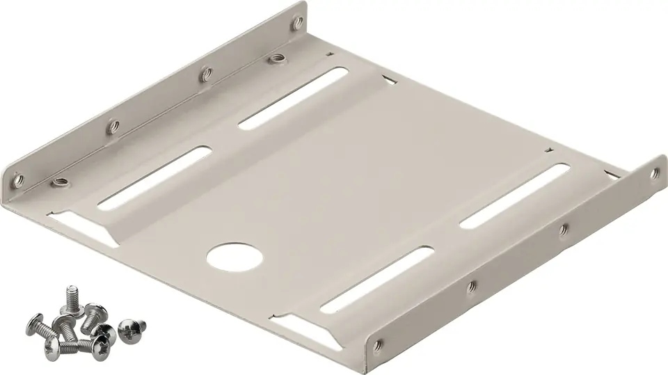Adapter that allows you to mount a 2.5" disk in place of a 3.5" disk. Fits any HDD or SSD, beige/grey color.