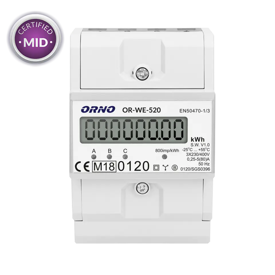 "The device for making indications in metric units (kWh), is used to directly measure active power in a three-phase system. A special electronic system under the influence of the flowing current and applied voltage generates pulses in an amount proportional to the electricity consumed. The energy consumption in the phase is indicated by the flashing of the LED. The number of pulses is converted into the energy consumed, and its value is indicated by the LCD display (6+2). Power supply: 230V~, 50Hz, base current: 5A, max. current: 80A, min. current: 0.25A, pulse frequency: 800 imp/kWh, accuracy class B, housing with a width of three modules, mounting on a DIN rail TH-35 mm, pulse output: power supply 12~27V, current ?27mA, pulse = 80ms. The energy measurement is carried out in accordance with EN50470-1:2006, EN50470-3:2006 of the MID Directive 2014/32/EU."