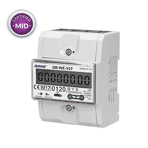 The device for making indications in metric units (kWh), is used for direct measurement of active power in a three-phase system and registration of the consumed electricity with the possibility of remote reading of registers of the indicator group, through the wired network of the RS485 standard. Protocol: Modbus-RTU type and 4 independent tariffs (user can set different times via RS485 port). Equipped with an IR optical port? works with the OR-WE-518 optical head. A special electronic system under the influence of the flowing current and applied voltage generates pulses in an amount proportional to the electricity consumed. The energy consumption in the phase is indicated by the flashing of the LED. The number of pulses is converted into the energy consumed, and its value is indicated by the LCD display (6+2). Power supply: 230V~, 50Hz, base current: 5A, max. current: 80A, min. current: 0.25A, pulse frequency: 1000 imp/kWh, accuracy class B, housing with a width of three modules, mounting on a DIN rail TH-35 mm. Energy measurement is performed in accordance with EN50470-1:2006, EN50470-3:2006 of the MID Directive 2014/32/EU.