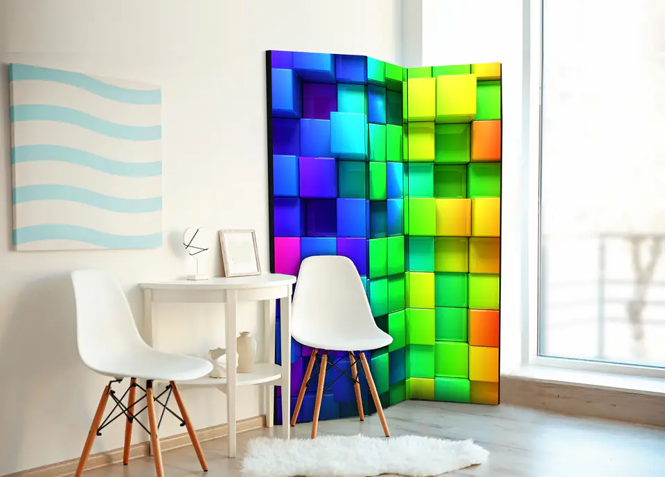 Decorative screen "3-piece screen - Colorful cubes [Room Dividers]" is a unique decoration for modern interiors. A 3-piece, made of wood and double-sided printed screen will not only discreetly divide the space but also create an amazing arrangement in the interior. Perfect workmanship and an original motif in Full HD print quality will make room screens give any interior a unique charm.