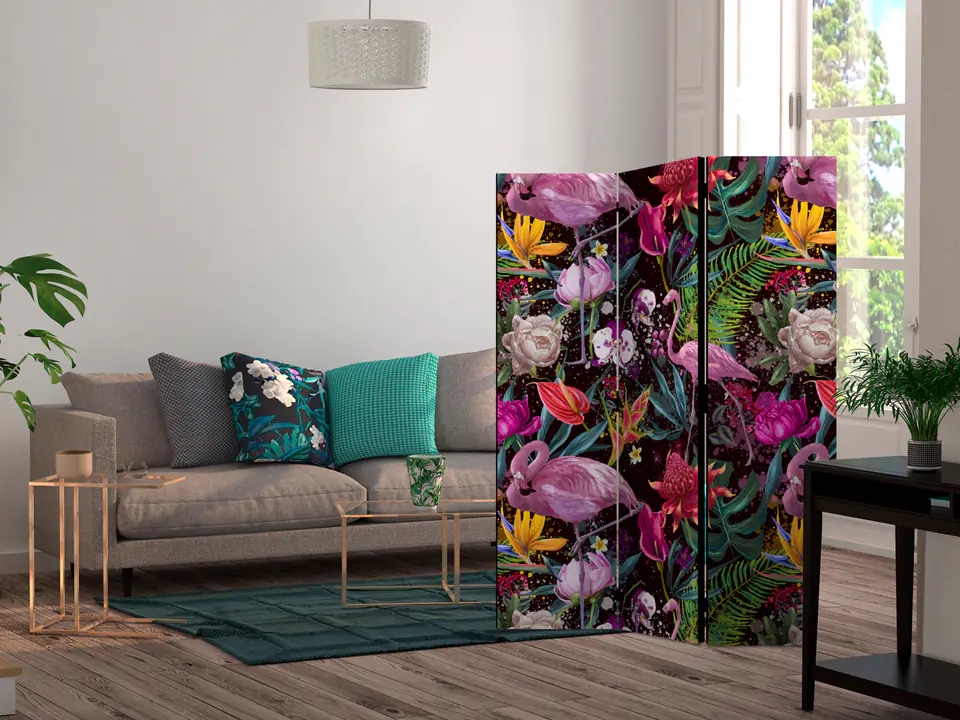 Decorative screen "3-piece screen - Colorful exoticism [Room Dividers]" is a unique decoration for modern interiors. A 3-piece, made of wood and double-sided printed screen will not only discreetly divide the space but also create an amazing arrangement in the interior. Perfect workmanship and an original motif in Full HD print quality will make room screens give any interior a unique charm.