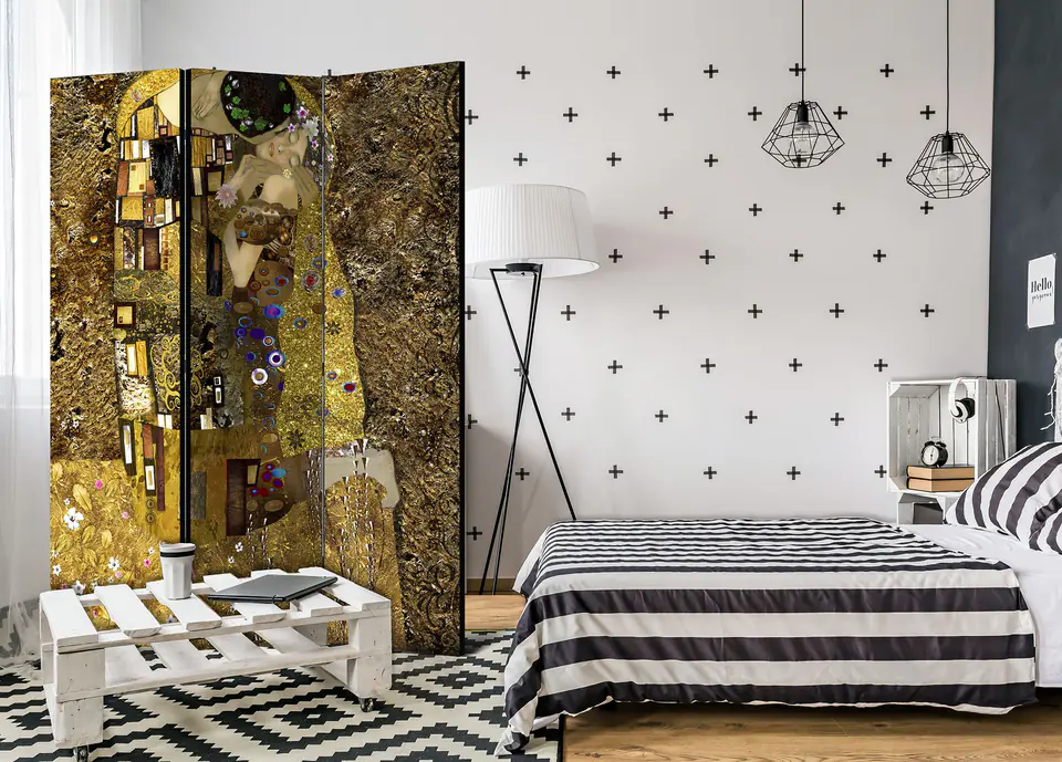 Decorative screen "3-piece screen - Golden kiss [Room Dividers]" is a unique decoration for modern interiors. A 3-piece, made of wood and double-sided printed screen will not only discreetly divide the space but also create an amazing arrangement in the interior. Perfect workmanship and an original motif in Full HD print quality will make room screens give any interior a unique charm.