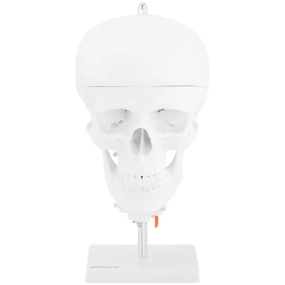The three-dimensional anatomical model of the Physa brand was made in a 1:1 scale. It presents bones, the brain in eight parts, jaws, teeth and seven cervical vertebrae. The 3D model reflects: frontal, parietal, nasal, ethmoid, lacrimal, sphenoid, occipital, temporal, zygomatic, upper jaw, lower jaw, teeth and mobile mandible. 8 parts of the brain: temporal, occipital, frontal, parietal, cerebellum and brain stem. 7 cervical vertebrae together with: hindbrain, spinal cord, carotid nerves, vertebral artery, basilar artery and posterior cerebral artery. The individual parts were made of plastic, which was covered with specially selected paints.