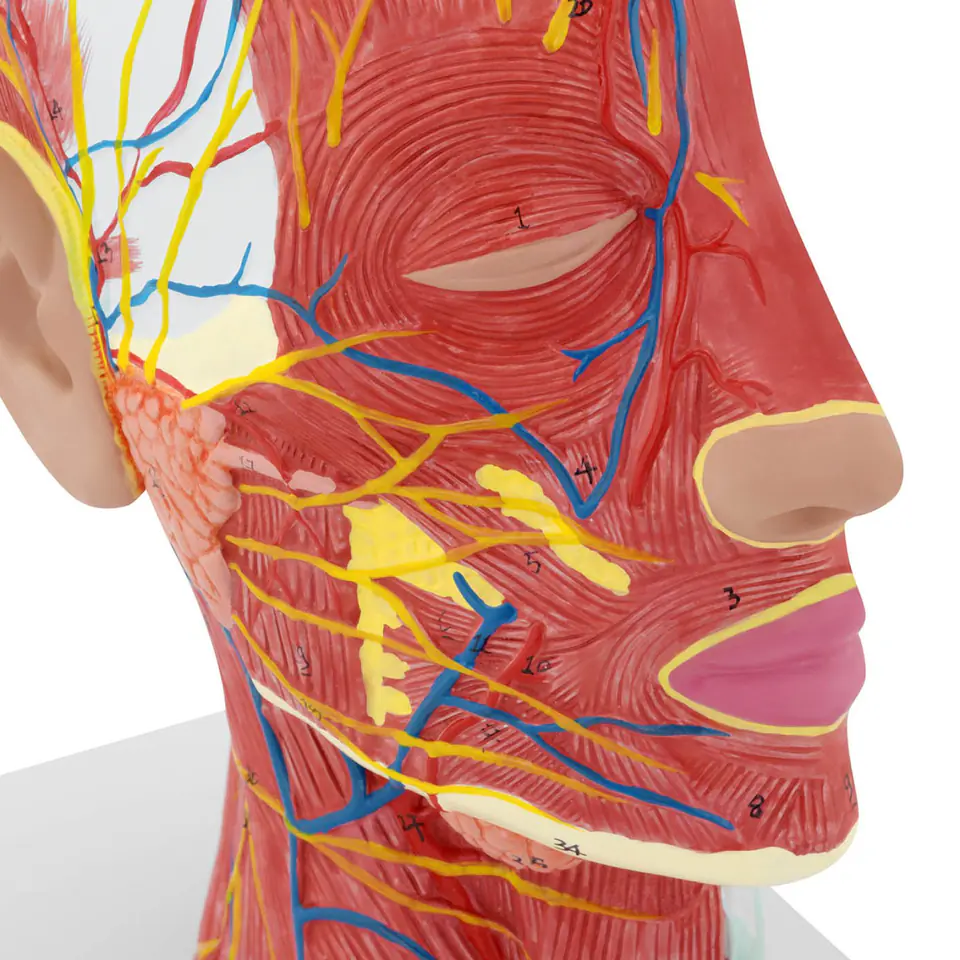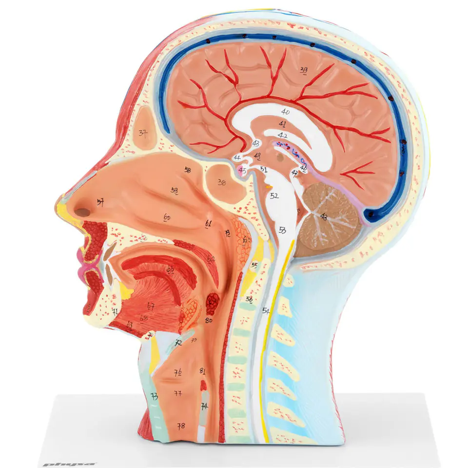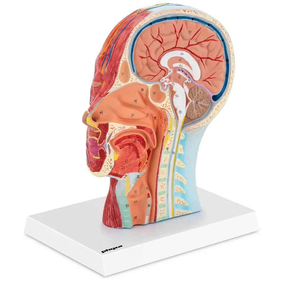 The anatomical model of the head and neck of a human by Physa is an excellent didactic aid when learning the structure of the human body. The double-sided design of the replica allows you to get acquainted with the individual elements. On the one hand, the inside of the head was presented, and on the other, muscles and blood vessels. Everything is described in the attached list. Detailed 1:1 scale 3D model. Model made of PVC plastic.