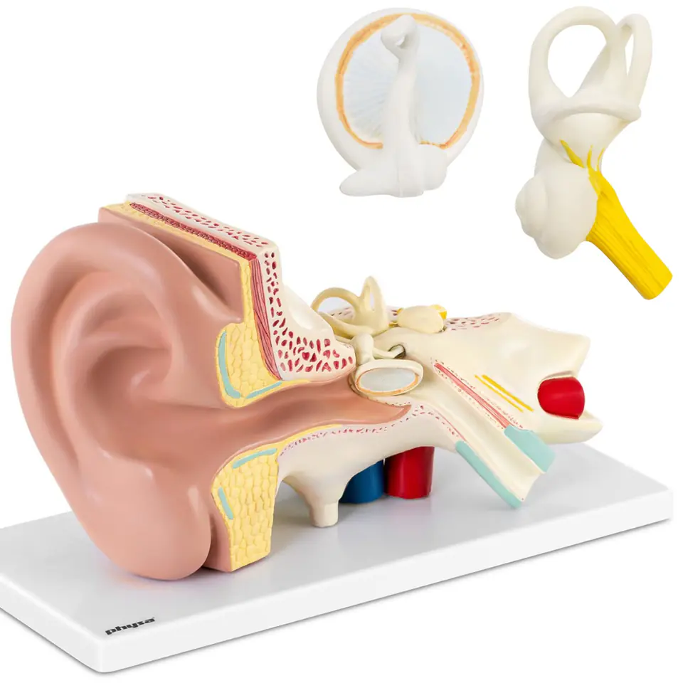 The anatomical model of the ear by Physa is a realistic three-dimensional construction of the outer, middle and inner ear, in which the individual structures are perfectly visible thanks to 3x magnification and color. The advantage is the ability to remove the elements of the middle and inner ear - the tympanic membrane, malleus, incus with a stirrup, as well as a labyrinth with a snail. Nerves are also well detailed. Model made of PVC plastic.