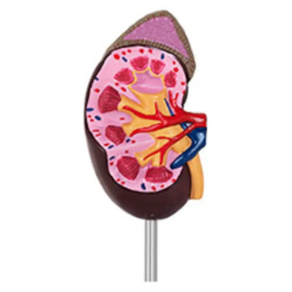 The three-dimensional model of the kidney was made with high precision and fully reflects the actual structure of the organs on a 1:1 scale. The cross-section shows the kidney cortex, its vessels and the renal pelvis. The model is made of durable PVC with a long service life and supported on a stable base.