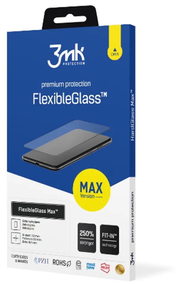FlexibleGlass Max is designed to fully protect the front panel of the phone. When falling, hybrid glass does not break into many sharp and dangerous pieces. FlexibleGlass Max shows scratch resistance at the level of 7H. Such high hardness, exceeding the protective films, was obtained by enriching the structure with an additional ceramic coating. FlexibleGlass Max absorbs impact energy and strengthens the screen by up to 250%. Thanks to the thickness of 0.2 mm and the adjustment of the frame to the color of the phone, you will forget that you are using it.