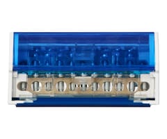 Distribution blocks mounted on a DIN rail or mounting plate are made of 4 clamping rails in the housing. They are used in electrical switchboards for the distribution of potentials and wiring.