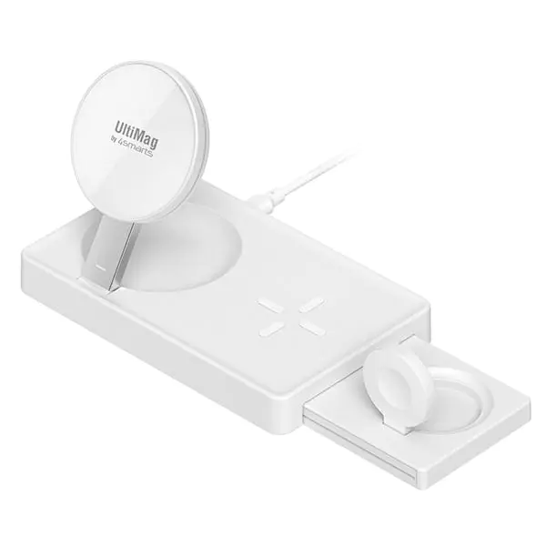 UltiMag Trident simultaneously charges Apple Watch, iPhone and AirPods with lightning-fast wireless charging. The charging station folds to save space when not in use.