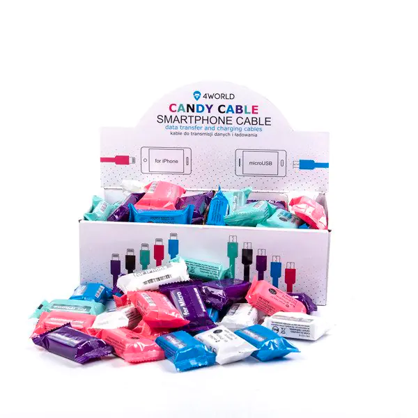 The presenter contains 50 4World cables for charging and data transmission. The set consists of 25 Micro USB cables and 25 Lightning cables for Apple devices. In the display there is a mix of colors: