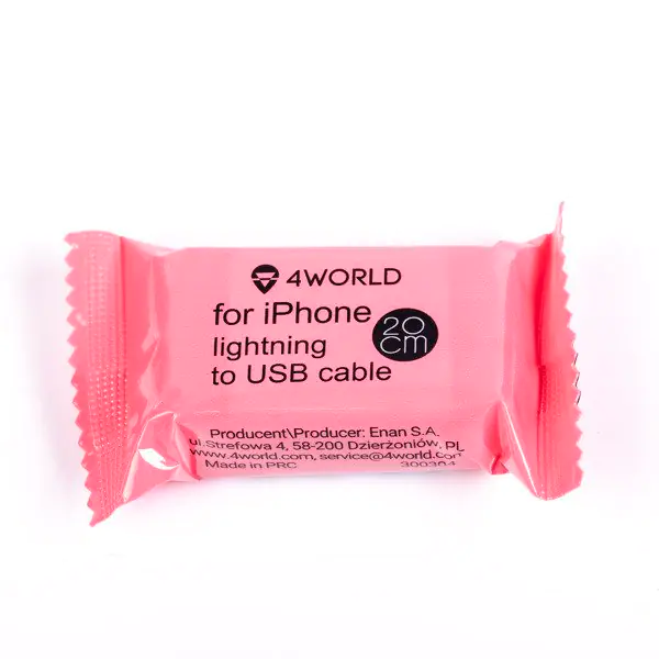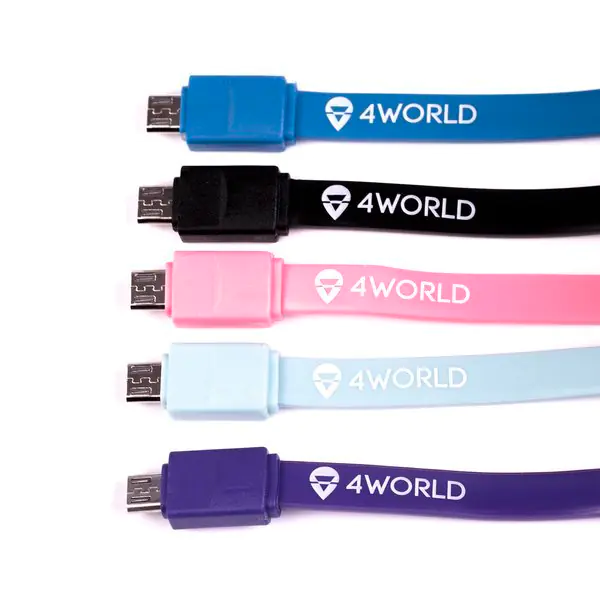 The presenter contains 50 4World cables for charging and data transmission. The set consists of 25 Micro USB cables and 25 Lightning cables for Apple devices.  In the display there is a mix of colors:
