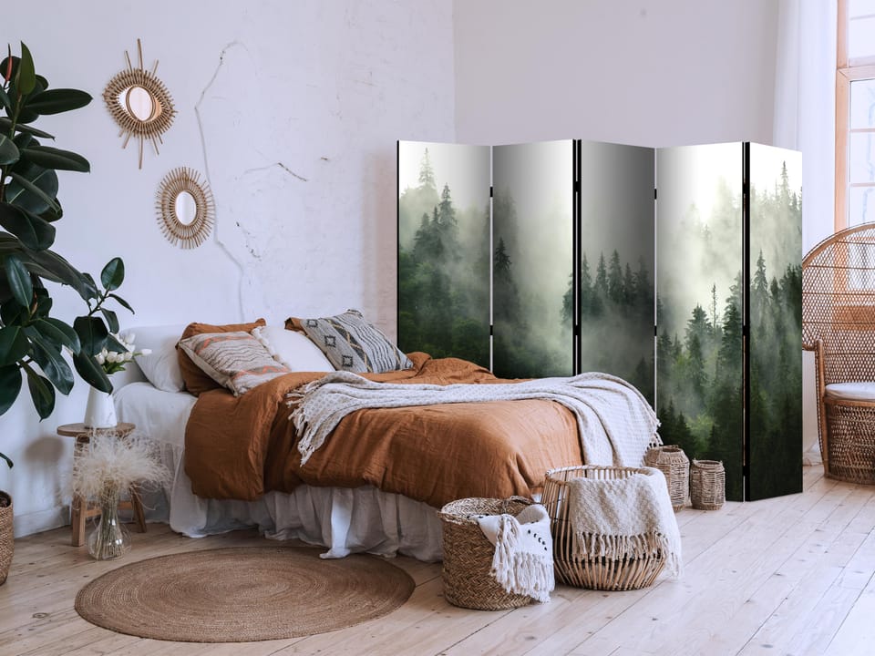Decorative screen "5-piece screen - Coniferous Forest II [Room Dividers]" is a unique decoration for modern interiors. A 5-piece, made of wood and double-sided printed screen will not only discreetly divide the space but also create an amazing arrangement in the interior. Perfect workmanship and an original motif in Full HD print quality will make room screens give any interior a unique charm.