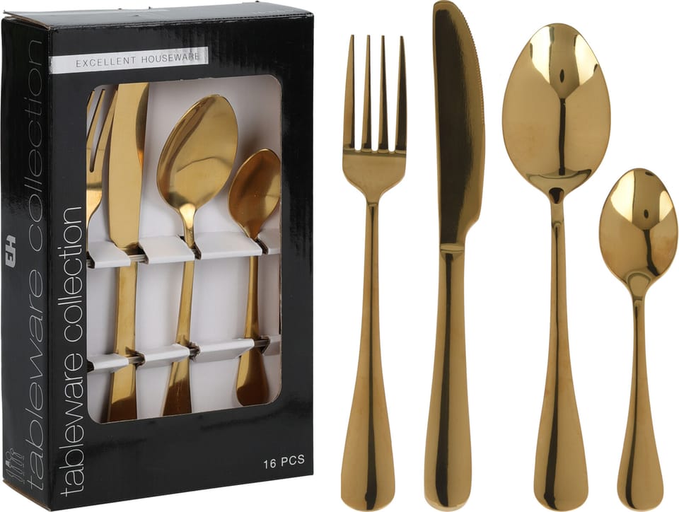 Elegant cutlery made of stainless steel in shiny gold. The set includes: - 4 spoons - 4 forks - 4 knives - 4 teaspoons The whole consists of 16 pieces. These elegant cutlery will be an indispensable element of sophisticated tableware. A set of cutlery will work during family dinners, elegant dinner or during a meeting with friends. We do not recommend washing in dishwashers.