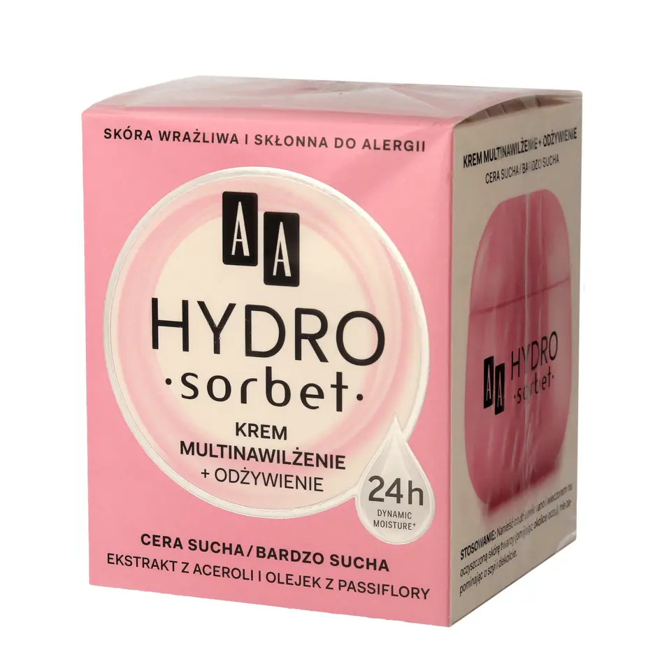 Discover the power of hydration in the AA Hydro Sorbet line.Light cream formulas are quickly absorbed, leaving the skin soft, intensely hydrated and silky smooth. The innovative Dynamic Moisture 24h System, supported by sea algae extract and valuable plant extracts, provides a long-lasting moisturizing effect. It works in two directions: it binds water in the epidermis and creates a protective layer that prevents moisture loss too quickly.