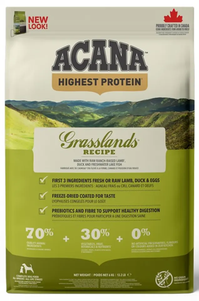ACANA Grasslands was inspired by Canada's vast meadows and lakes. Contains fresh lamb, duck, eggs, fish and turkey.