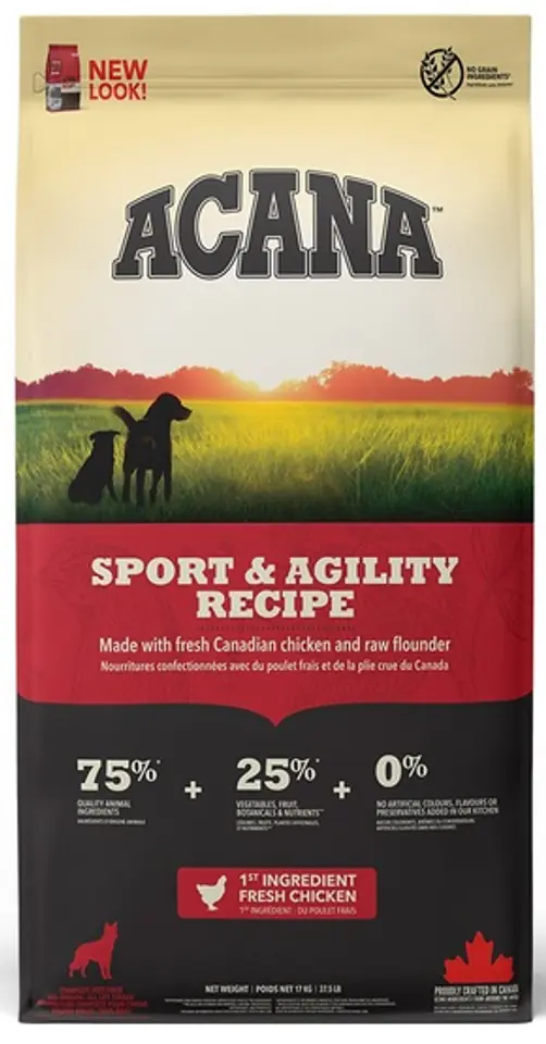ACANA DOG Sport & Agility contains wholesome animal protein: chicken and flounder caught in the natural environment. These ingredients are delivered to our kitchen FRESH or RAEW.