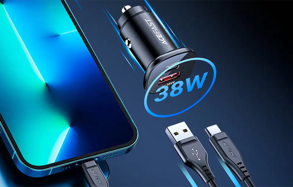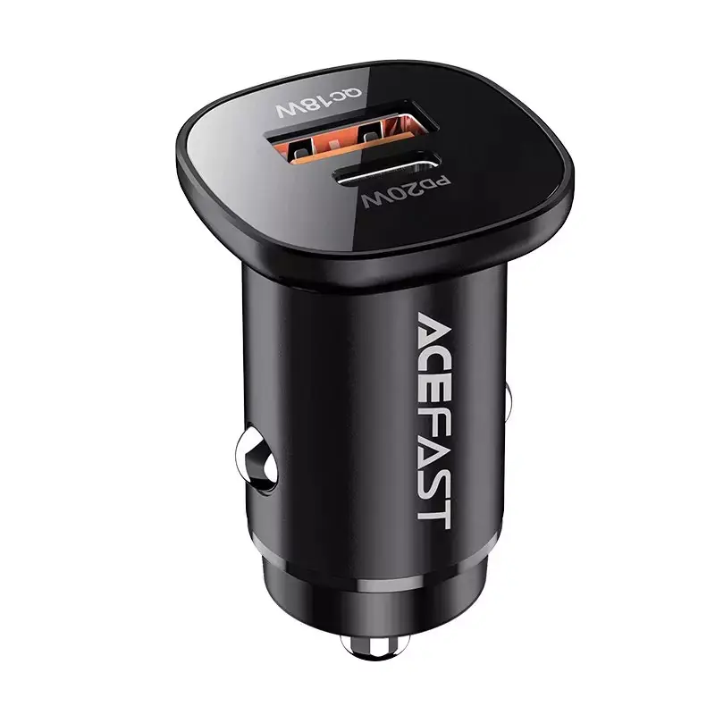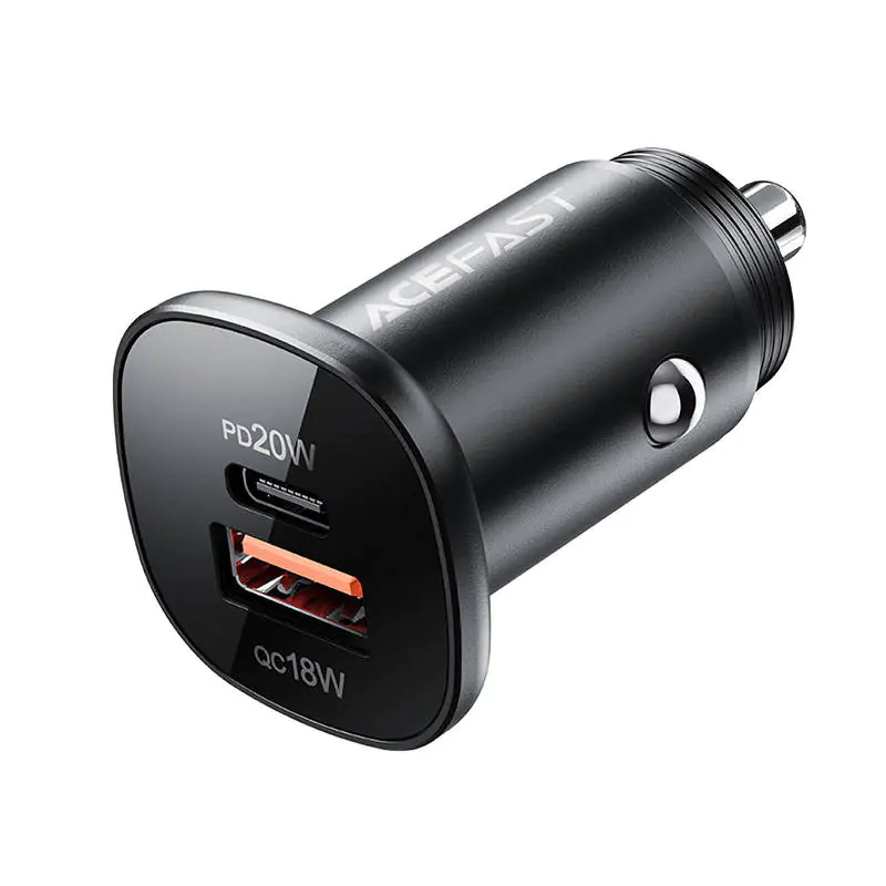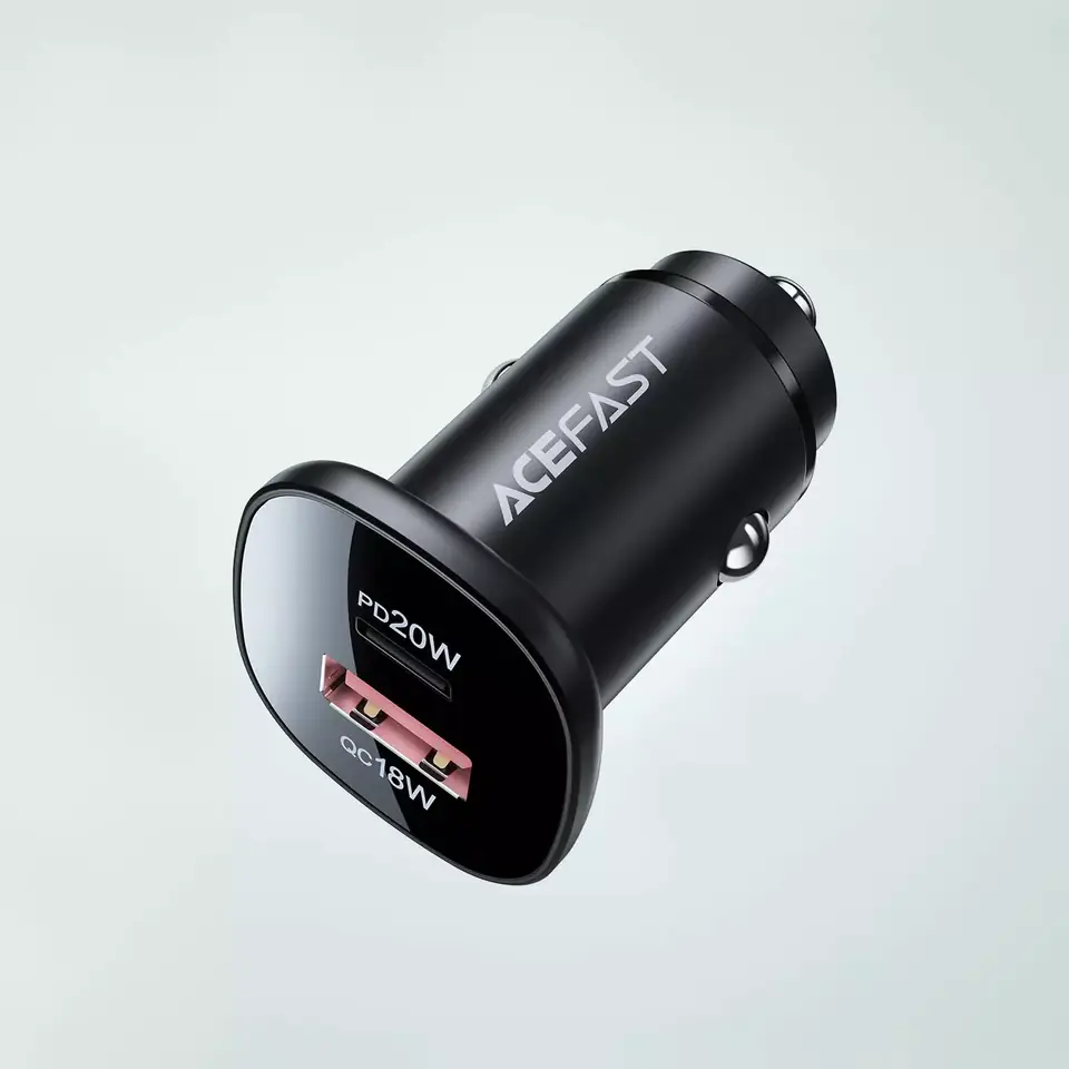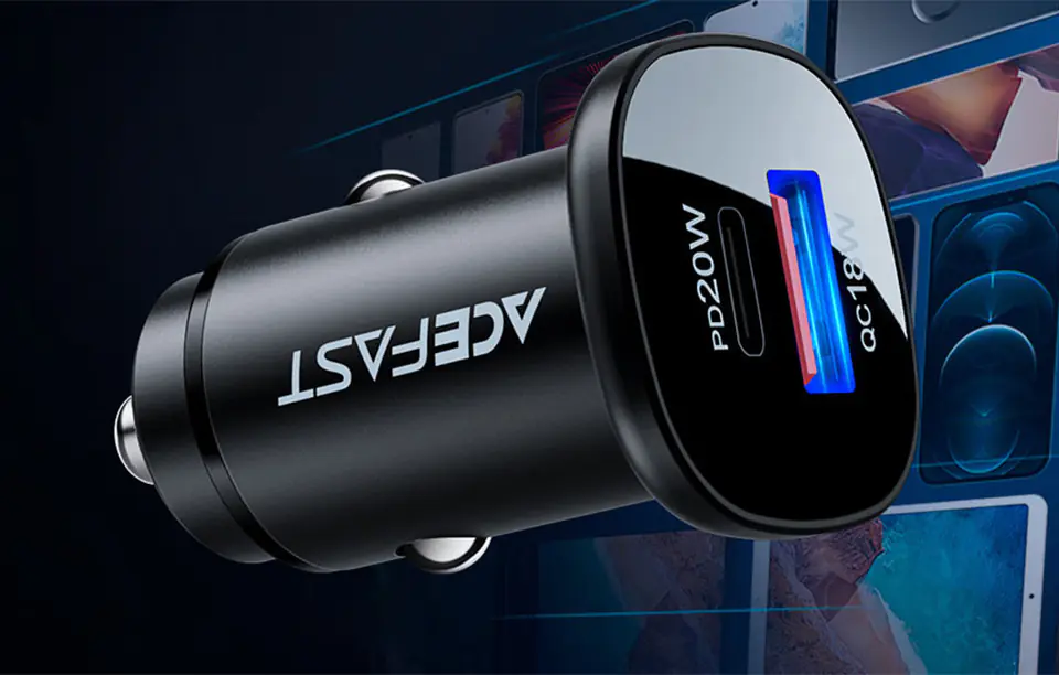 Fast car charger brand Acefast. It has 2 ports, USB Type C and USB. The first USB Type-C plug allows charging with a maximum power of 20W, and the USB plug up to 18W. It allows for fast charging, m.in. in PPS, Power Delivery, Quick Charge 3.0, AFC and FCP standards. You can connect 2 devices to it at the same time. It is made of fireproof PC material. It has been equipped with many protections such as against overheating, overvoltage, high voltage or overload.