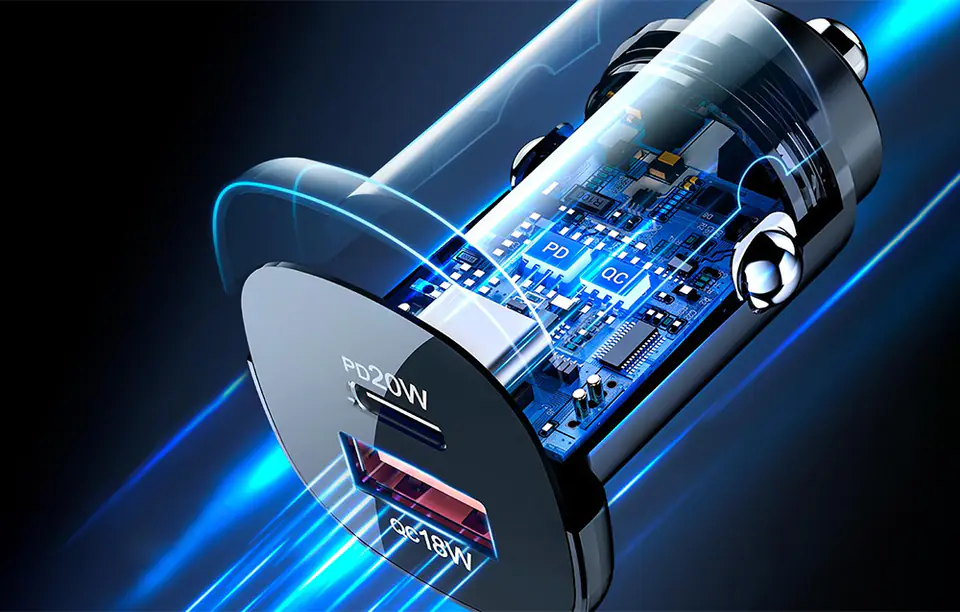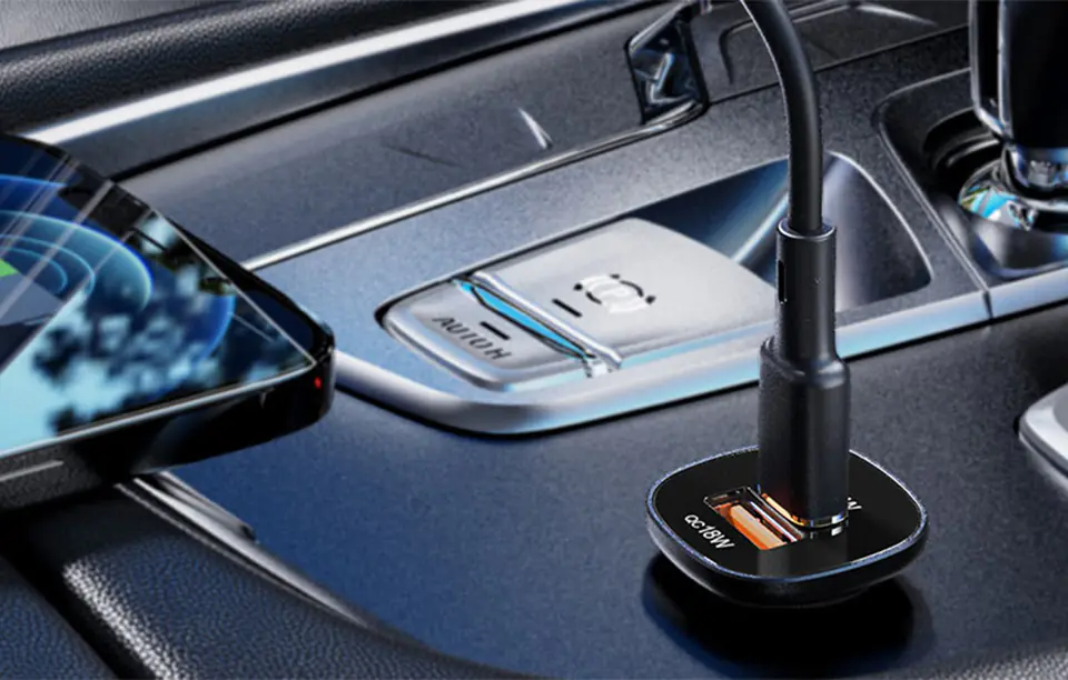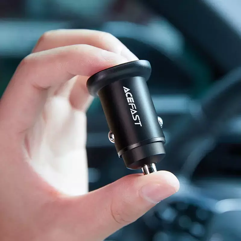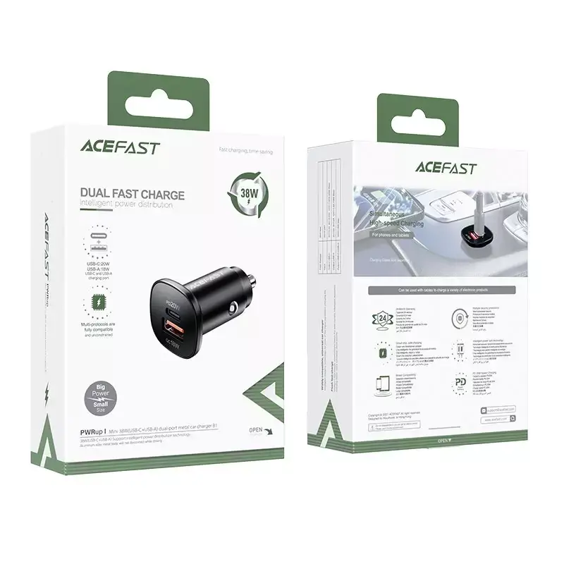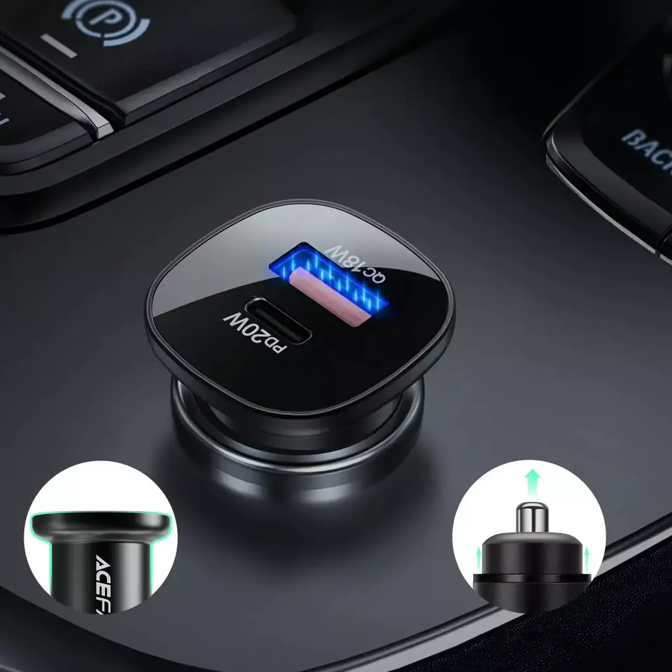 Fast car charger brand Acefast. It has 2 ports, USB Type C and USB. The first USB Type-C plug allows charging with a maximum power of 20W, and the USB plug up to 18W. It allows for fast charging, m.in. in PPS, Power Delivery, Quick Charge 3.0, AFC and FCP standards. You can connect 2 devices to it at the same time. It is made of fireproof PC material. It has been equipped with many protections such as against overheating, overvoltage, high voltage or overload.
