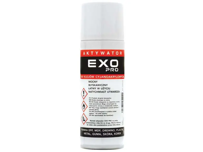 EXO PRO activator is a specialized product in the form of an aerosol that accelerates the polymerization (bonding) of EXO, EXO PRO cyanoacrylate adhesives or other such adhesives available on the market. It allows you to glue thicker welds and increases adhesion.