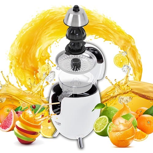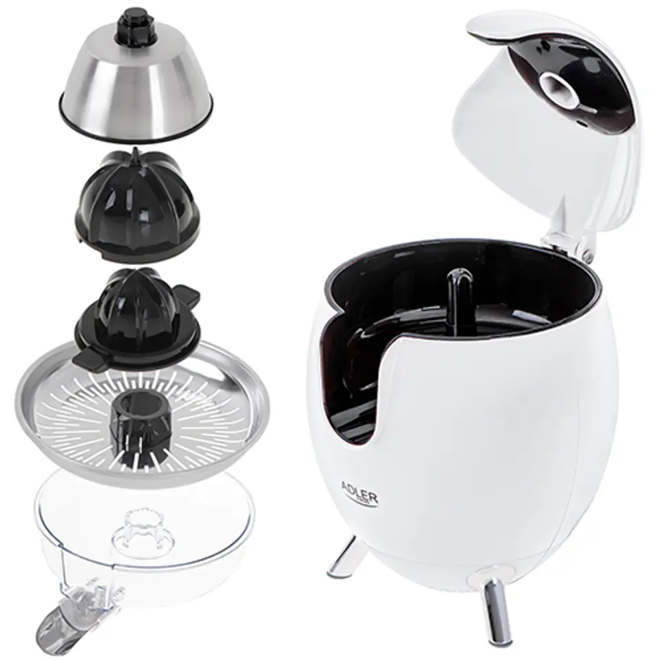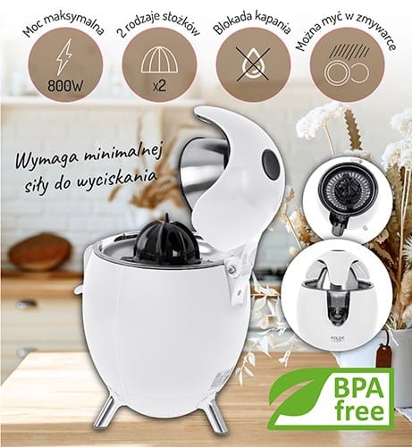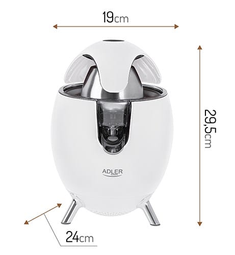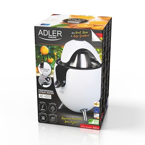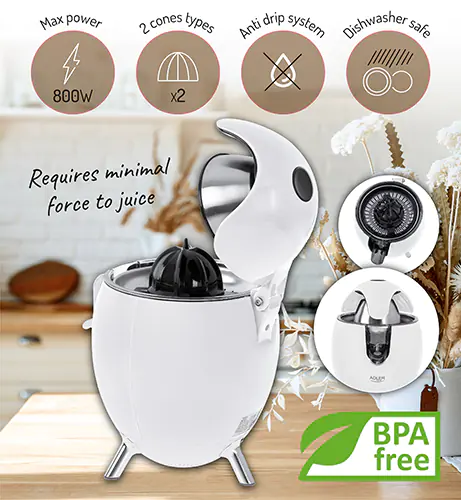 Aesthetic citrus juicer Adler 4013 with a power of 800 W. Allows for efficient preparation of fresh juice of lemons, oranges and grapefruits. The protective cover prevents the juice from splashing on the table or kitchen countertop. The juicer has 2 squeezing cones, suitable for fruits of different diameters. The convenience and simplicity of use of the product will make it an ideal purchase for anyone who appreciates healthy eating and fresh unprocessed juices as a supplement to their diet. Its elegant appearance and ease of storage make it ideal for any type of kitchen, even the smallest one where every centimeter of surface counts.