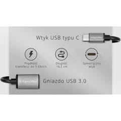 Try the Kruger & Matz Basic OTG cable today and see how easily you can improve the comfort of using your mobile devices! The cable at one end is terminated with a USB Type-C plug, and on the other with a USB socket. This solution will allow you, m.in, to connect a pendrive to a notebook that is not equipped with a standard USB port.