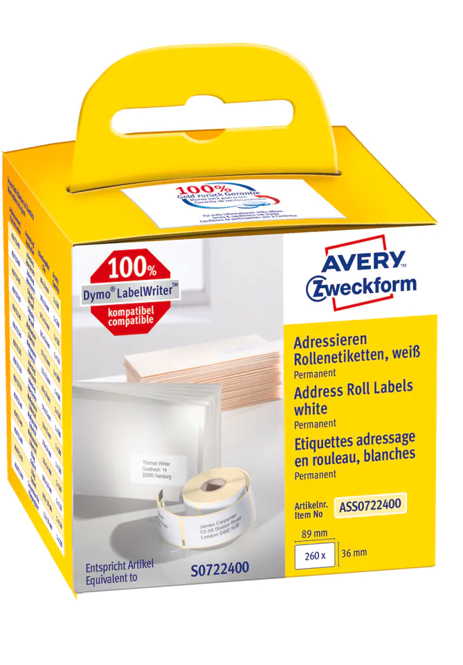Address labels in roll 36x89mm 260 ethical.durable, white ASS0722400 Avery Zweckform