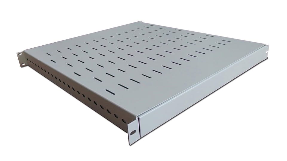 Adjustable shelf 19", 1U, depth 500-900 mm, load capacity 100kg, mounting in 4 points, grey, screws in set