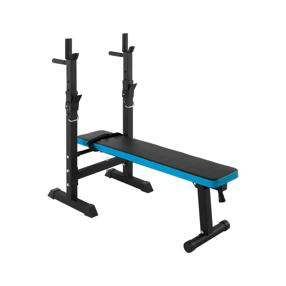 Adjustable straight weight bench with REBEL ACTIVE stands