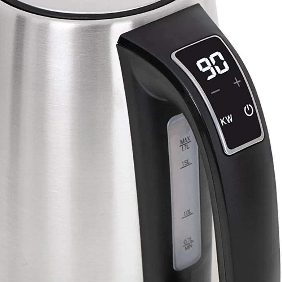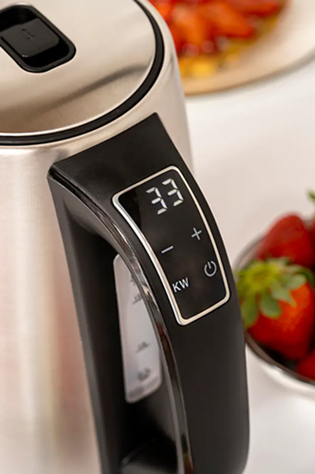 Nowoczesny stalowy czajnik z wyświetlaczem temperatury LCD i 7 stopniową regulacją temperatury oraz funkcją podtrzymania temperatury. W trybie gotowania wody do jednej z możliwych temperatur od 40°C do 100°C wyświetlacz LCD wskazuje aktualną temperaturę wody gotując do pożądanej wartości. W trybie podtrzymania temperatury wyświetlacz LCD wskazuje stale ustawiony poziom temperatury, którą urządzenie utrzymuje podgrzewając wodę cyklicznie przez 2 godziny. Sygnał dźwiękowy przy uruchamianiu i po zagotowaniu wody przypomina o zalaniu wodą ulubionego napoju. Bezpieczeństwo użytkowania zapewnia blokada uniemożliwiająca włączenie pustego czajnika, automatyczne wyłączenie po zagotowaniu wody oraz system kontroli bezpieczeństwa STRIX.