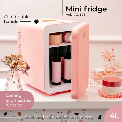 The Adler Mini Fridge is perfect for use at home and in the car, it will help you cool your favorite drinks and maintain the temperature of your dishes. Made of durable materials and using a Peltier cell in the cooling system, the portable refrigerator is a good solution when traveling and on vacation. This device is ideal for storing snacks, as well as cosmetics and medicines. The capacity of 4 liters means there is room for various sizes of cans, bottles, jars and food containers. A shelf and a mini basket on the door will make it easier to organize smaller products. The most interesting functionality of our refrigerator is the cooling and heating function, available in one device. Thanks to the aluminum elements of the chamber, cold and heat reaches all products inside the refrigerator. The cooling temperature is approximately 18-22°C below ambient temperature and the heating temperature is above 18-22°C. This way you can cool mineral water, carbonated drinks, vegetables and desserts, and store cold meats and dairy products. In turn, the heating option will help maintain the temperature or heat up the selected dish.