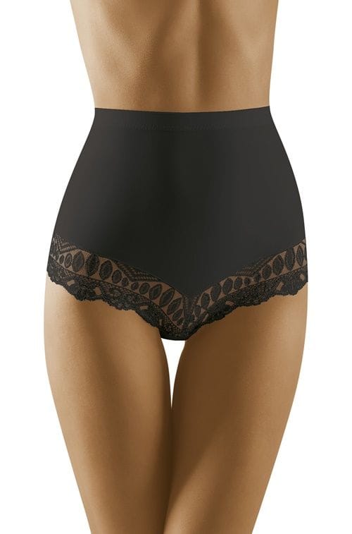 Higher briefs gently modeling the body. Decorated with charming lace along the line of thighs and buttocks. They subtly flatten the abdomen and thus improve the proportions of the body. Composition: 58% polyamide, 42% elastane.