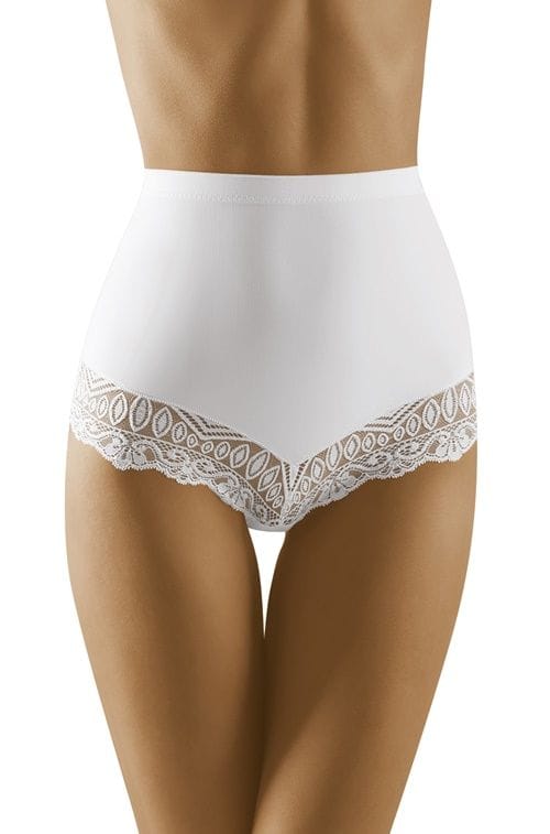 Higher briefs gently modeling the body. Decorated with charming lace along the line of thighs and buttocks. They subtly flatten the abdomen and thus improve the proportions of the body. Composition: 58% polyamide, 42% elastane.