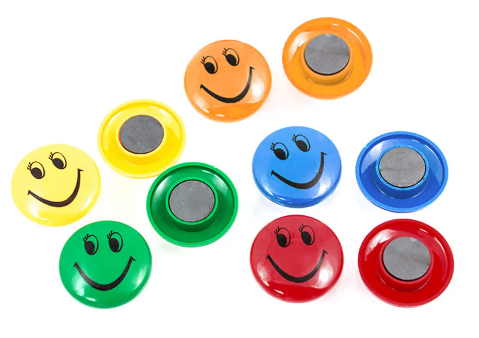 - A round magnetic stamp with a Smile pattern, i.e. a smiley, a smiley face, will decorate any thing to which you attach it.