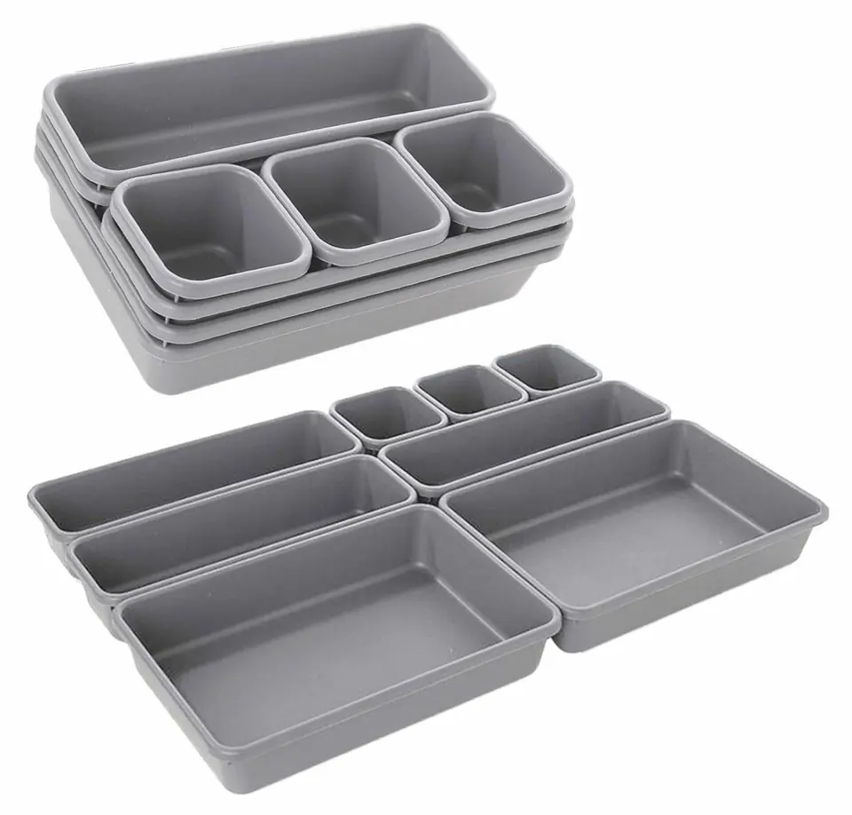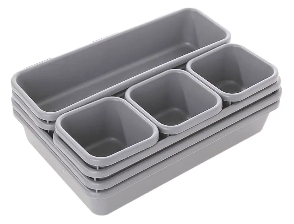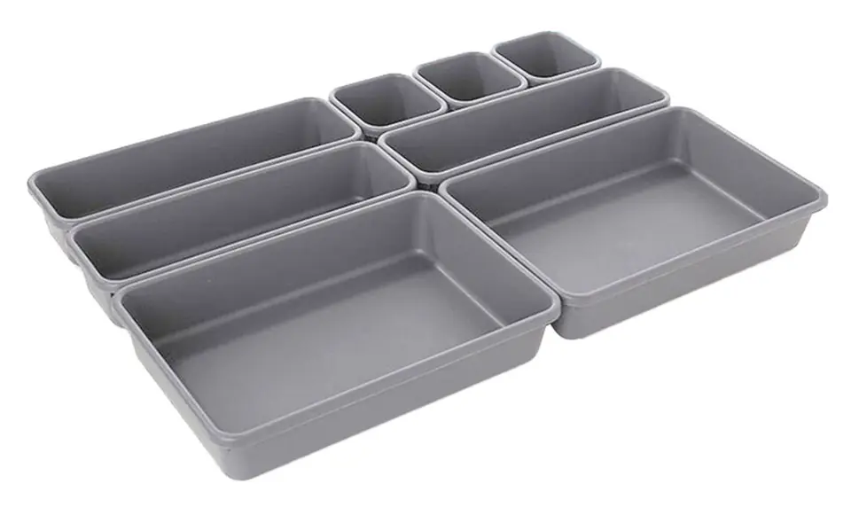 Extremely practical organizer for easy storage of items in a drawer. Thanks to the modular structure (it consists of 8 elements of different sizes), you can arrange them in the way you want. The possibility of using the organizer as a handy compartment for small items. Made of solid plastic, which will ensure long and trouble-free use. It will also work great as a desk organizer or for cosmetics.