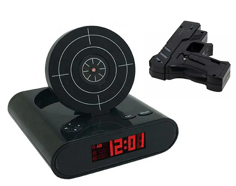 A sniper's alarm clock with a shield and a pistol-shaped remote control is a brilliant gadget and a great gift idea for every sleepyhead! If you have trouble getting up or can't drag your significant other out of bed, seriously consider this solution :) The only way to turn off the set alarm (default or your own, pre-recorded and sufficiently annoying sound) is to point the gun (remote control) at the target and direct the infrared beam at it. This is not only an effective method to wake up (the alarm clock will raise even the dead), but also great fun! You won't even notice the moment when you finally want to take your head off the pillow! The device does not require access to the electrical network. To power it, all you need is a set of 6 AA batteries (4 batteries for the alarm clock and 2 batteries for the gun).