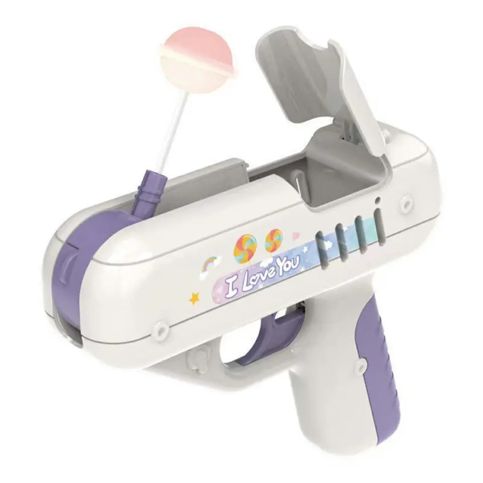 A wonderful toy for children. Surprise pistol for lollipops. After pressing the trigger from under the flap in the upper part of the toy, a lollipop shoots out. The toy is very easy to use, and 3 replaceable LR44 batteries are enough to power it. Give your child a sweet surprise :)