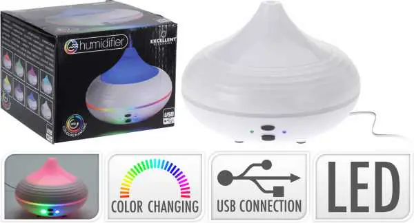 Air Humidifier with LED Lighting The humidifier uses ultrasonic waves to instantly evaporate the water and essential oil in the tank to create a cool, dry fragrance mist. This high-quality aroma diffuser also has an auto power off function that ensures that the device turns off when water runs out. This fragrance diffuser can hold up to 120ml of water, up to 3 hours of fog per filling. Color LED Lighting Mode: The color can be cyclically switched or set to one fixed color. Unique Design: With modern design, simply add drops of your favorite essential oil to give your room a fresh, clean scent. it will fill your space with a beautiful fragrance. as a decorative element, perfect for your room, office, yoga room, hotel room, etc. Technical data: USB cable, Dimensions:14,4x11,5cm, LED lighting, Capacity: 130ml, Cable length: 1m,