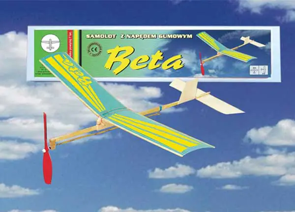 Very easy to install BETA model with rubber drive. The fuselage of the aircraft is made of balsa and pine, and the wings are made of durable foam. In addition, the chassis for the model is included. The whole is self-assembly.