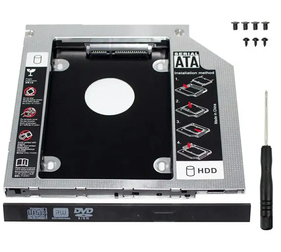 Aluminum bay for an additional 2.5"' INCH SATA HDD or 2.5" SSD. The pocket is placed in the notebook case in the standard mounting location of the 12.7 mm SATA CD/DVD drive. The device is compatible with SATA I, II, III standards and compatible with most notebooks available on the market with a SATA CD/DVD optical drive.