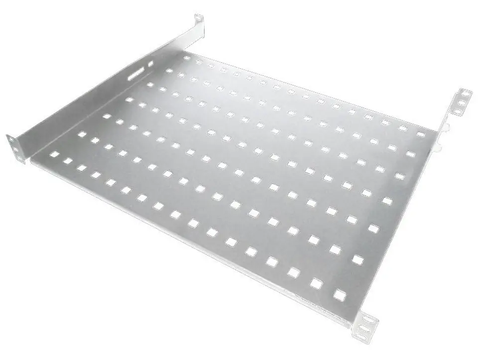 Shelves that fit into 19" cabinets. They are the basis for the installation of free-standing electronic devices in ICT cabinets. They are made of powder-coated steel sheet in gray. Perforated base, four attachment points.