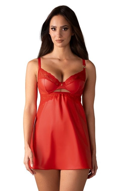 Koszulka nocna Aliosa w intensywnie czerwonym kolorze to połączenie zmysłowości i elegancji. Połyskujący materiał delikatnie otula ciało, a koronka i wycięcie pod biustem tworzą subtelny, ale przyciągający spojrzenie akcent. Regulowane ramiączka i zapięcie na haftki pozwalają na idealne dopasowanie, a fiszbiny w miseczkach modelują biust i dodają pewności siebie. Zawieszka z sygnetem Obsessive to biżuteryjny detal, który podkreśla wyjątkowość tej bielizny.
