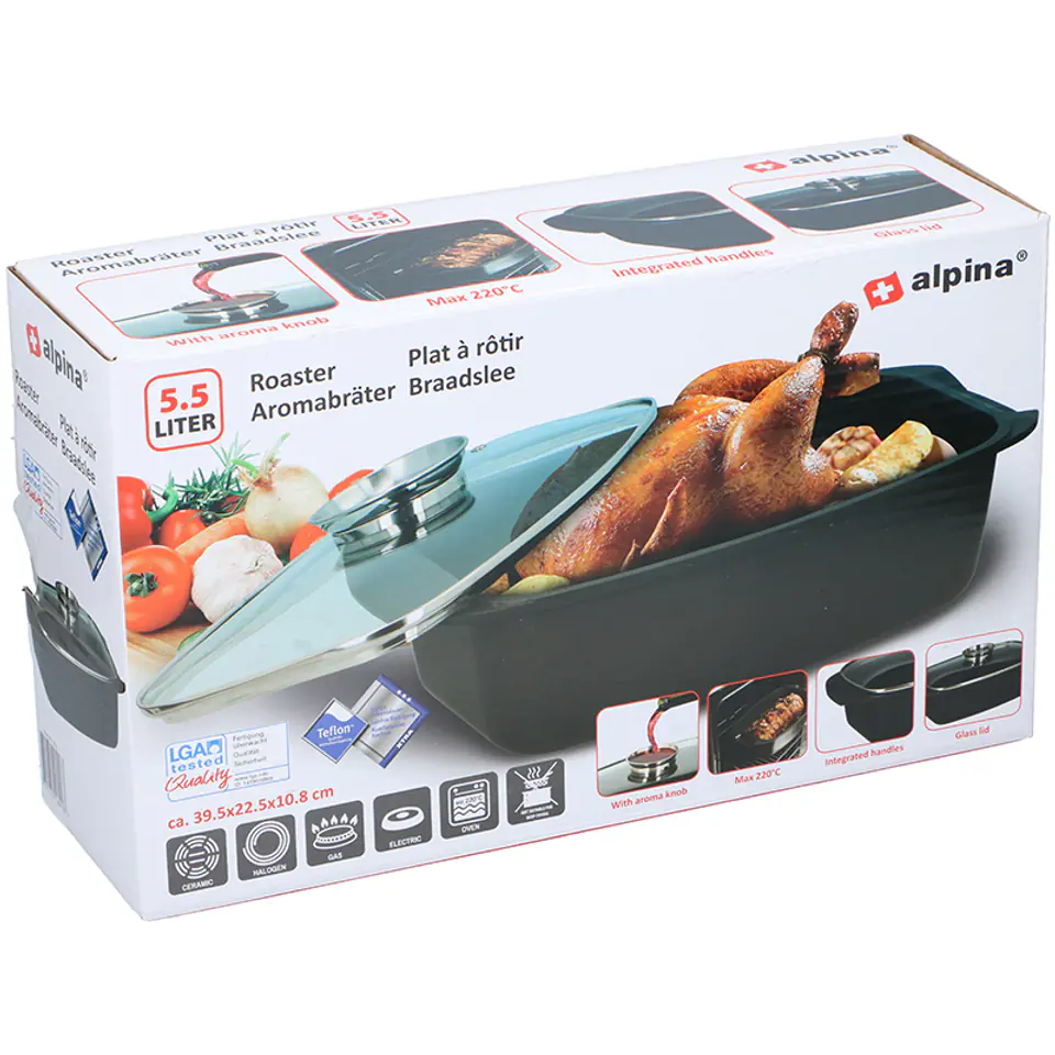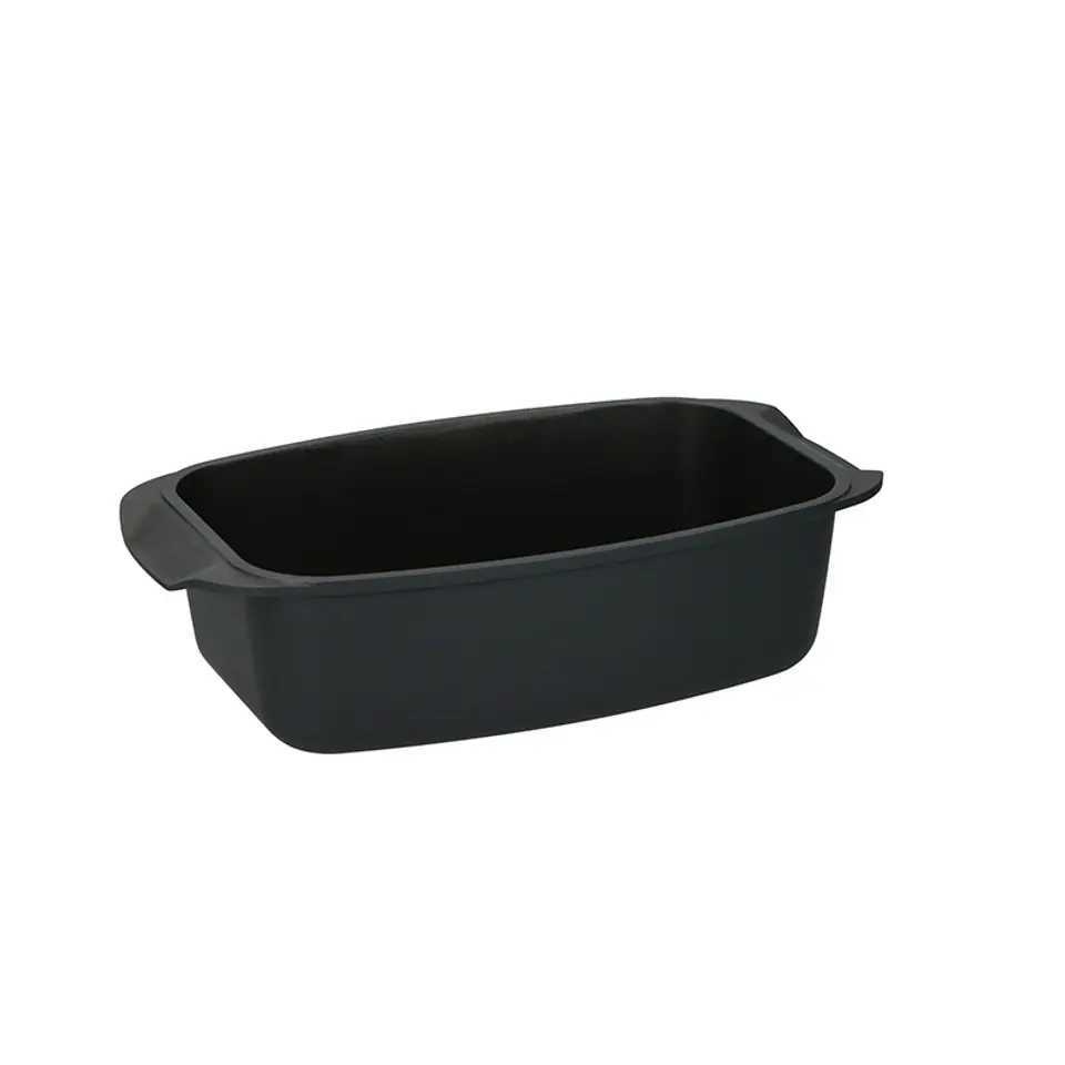 Practical rectangular dish/roasting pan for aromatic low-fat frying, cooking or stewing your favorite dishes.