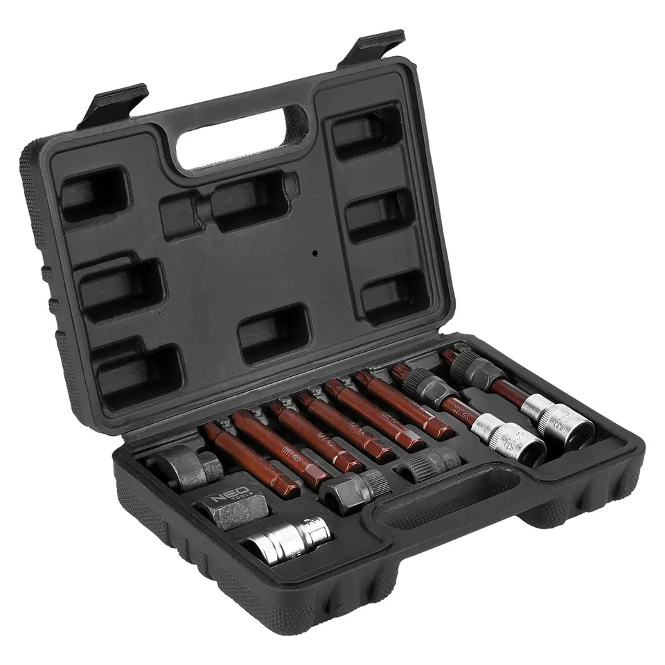 A set of keys for assembling and disassembling alternators type Bosch and Magneti Marelli. For cars of brands: Audi, BMW, Fiat, Ford, Mercedes, Opel, Porsche, Renault, Peugeot, Seat, Skoda, Volvo, VW and others. Included: 1/2" mandrel wrench - T50 with sliding wrench 33 teeth (Bosch type), 1/2" mandrel wrench - SPLINE M10 with sliding key 33 teeth (Bosch type), 6-point bit T40, 6-angle bit T50, 6-angle bit SPLINE M8, 6-point bit SPLINE M10, 6-point bit HEX 8 mm, 6-point bit HEX 10 mm, spline cap 6-point 15 mm x 33 teeth (Porsche), spline cap 6-point 22 mm x 33 teeth (Mercedes), 6-angle mandrel cap 17 mm x 4 pins (Magneti Marelli type), 6-point cap 22 mm (Renault, Volvo), bit adapter 1/2 x 10 mm Alternator disassembly kit, set of 13 pcs. NEO is a professional set of keys for assembling and disassembling Bosch and Magneti Marelli alternators. Suitable for cars of brands: Audi, BMW, Fiat, Ford, Mercedes, Opel, Porsche, Renault, Peugeot, Seat, Skoda, Volvo, VW and others. The keys in this set allow you to simultaneously unscrew the bolt fixing the pulley (using the appropriate bit) and hold the wheel with the clutch (using a specialized cap). The set is in a convenient suitcase. The set includes: 1/2" shank wrench - T50 with sliding key 33 teeth (Bosch type), 1/2" mandrel wrench - SPLINE M10 with sliding key 33 teeth (Bosch type), 6-angle bit T40, 6-angle bit T50, 6-point bit SPLINE M8, 6-point bit SPLINE M10, 6-point bit HEX 8 mm, 6-angle bit HEX 10 mm, spline cap 6-angle 15 mm x 33 teeth (Porsche), spline cap 6-point 22 mm x 33 teeth (Mercedes), 6-point mandrel cap 17 mm x 4 pins (Magneti Marelli type), 6-point cap 22 mm (Renault, Volvo), adapter for bits 1/2 x 10 mm.